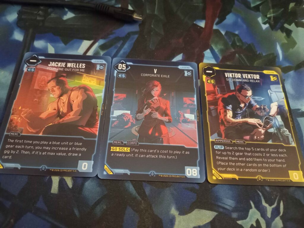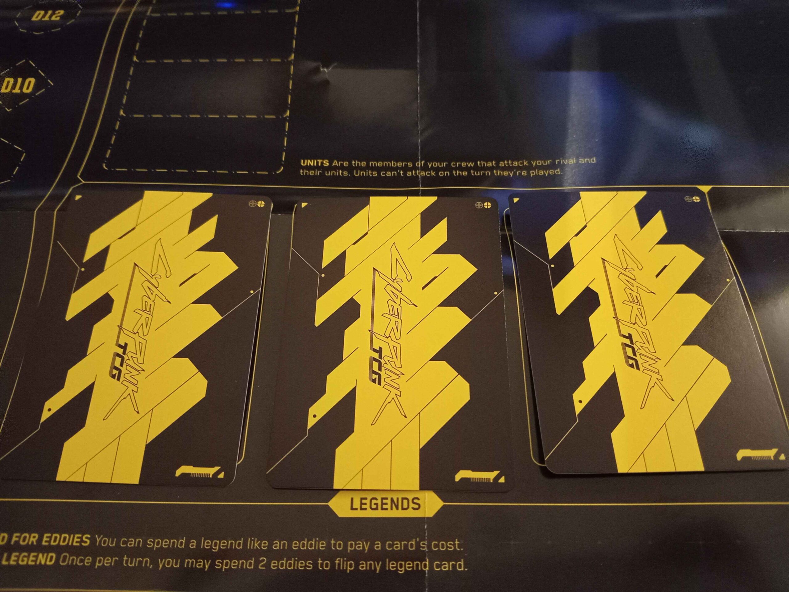 In Cyberpunk TCG, a legend doesn't represent us, meaning when the opponent attacks us, they aren't targeting our legend. Rather, they are faction leaders, sort of glorified units with their own area of play. We have three legends in our deck, and they start as blank energy, in their dedicated area on the play mat.