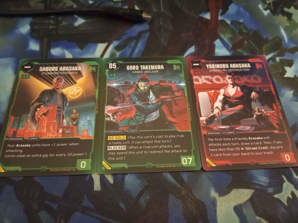 We had a Red - Green deck based around the Arasaka cards. It played like an aggressive build with various ways to buff units or support our attacks.